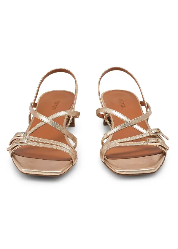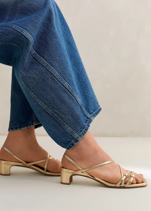 In A Molten Metallic Finish, This Sandal Finds The Balance Between An Everyday And Evening Shoe Thanks To A Comfortable Mid-Height Kitten Heel And A Series Of Crisscrossing Straps In Gold-Toned Italian Leather.
