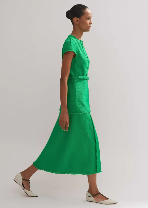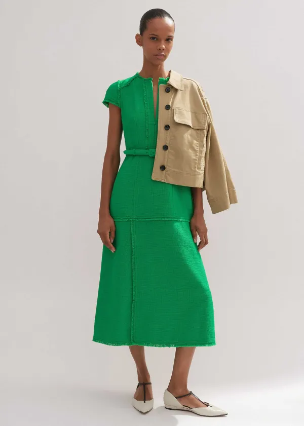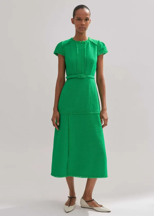 In A Bold Spring Green Hue, This Midi Dress Is Cut To A Flattering, Structured Silhouette With Cap Sleeves And Distresse…