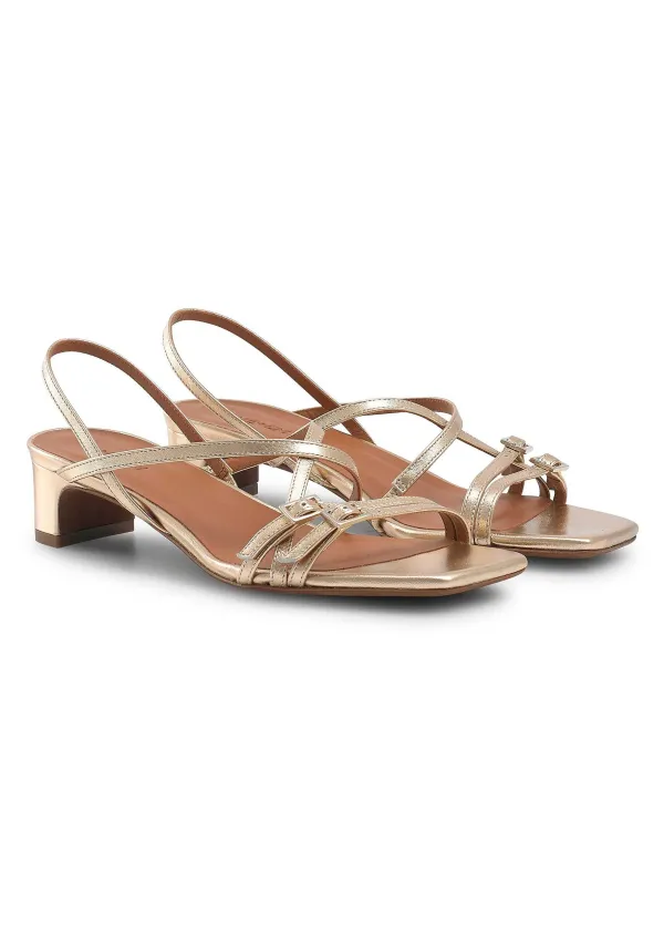 In A Molten Metallic Finish, This Sandal Finds The Balance Between An Everyday And Evening Shoe Thanks To A Comfortable Mid-Height Kitten Heel And A Series Of Crisscrossing Straps In Gold-Toned Italian Leather.